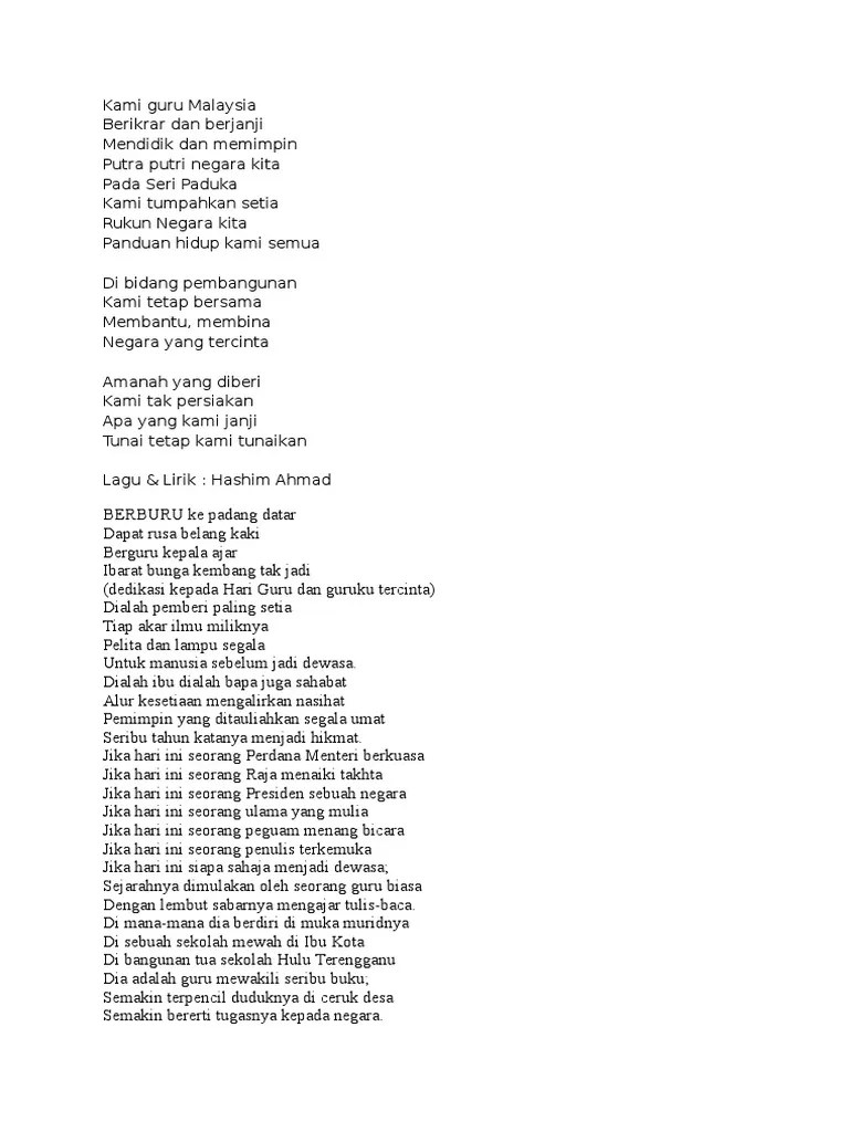 Lirik lagu kami guru malaysia. Kami guru malaysia berikrar dan berjanji mendidik dan memimpin putra putri negara. Lirik lagu guru malaysia kami guru malaysia berikrar dan berjanji mendidik dan memimpin putra putri negara kita pada seri paduka kami tumpahkan setia rukun . Lirik lagu kami guru malaysia kami guru malaysia berikrar dan berjanji. Kami guru malaysia berikrar dan berjanji.